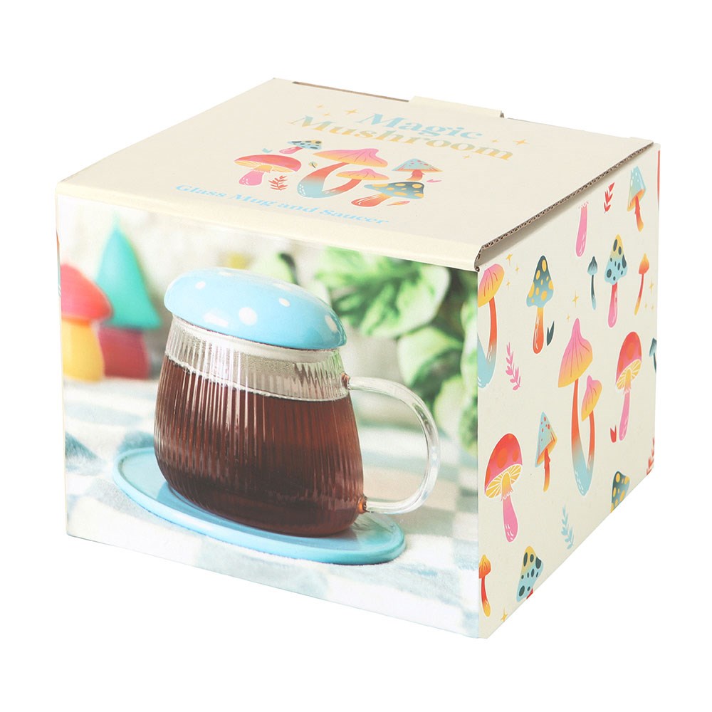 Make each day brighter with this fun and whimsical mushroom mug. Paired with a matching coaster and made from glass, this design is given a groovy twist with a sky blue colourway, making it the perfect vessel for hot and cold drinks. 460ml. Do not microwave. Hand wash only.